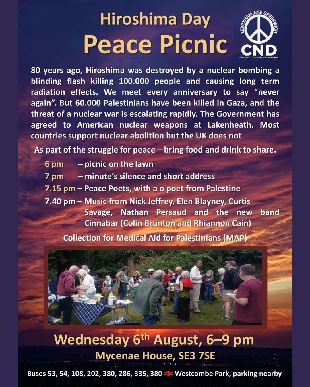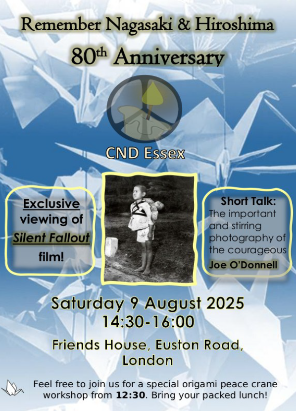 The ceremony seeks to reflect on the horrors of war in an atomic age, and to pray together for peace and harmony between all peoples and nations. This event is supported by London CND, with a short speech from one of our Vice Chairs.