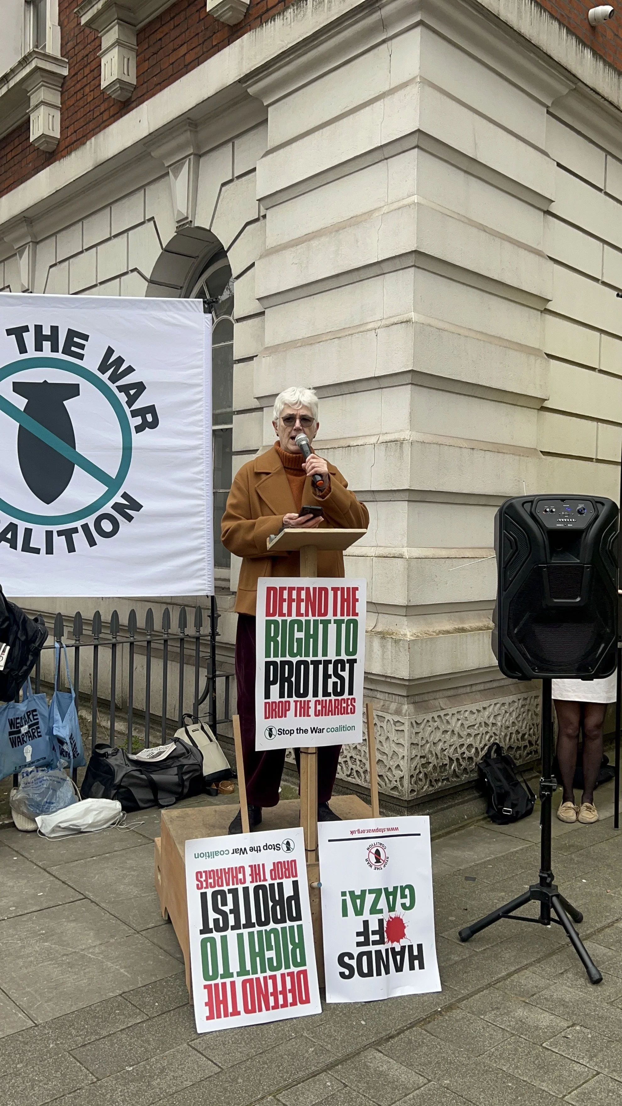 Outside the court: London CND Chair, Carol Turner addressed the demonstration.
