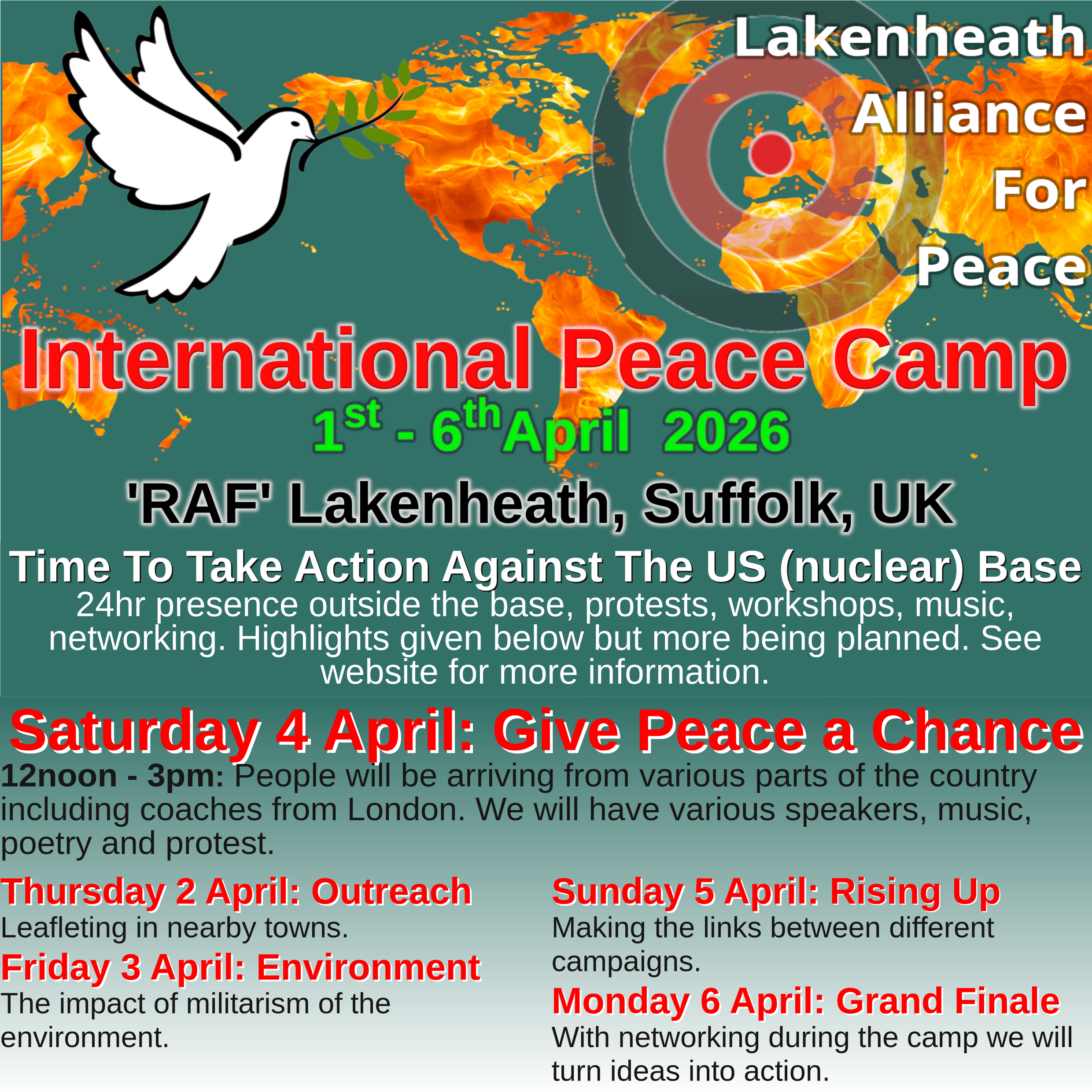 Lakenheath Alliance for Peace is planning its second International Peace Camp on 1-6 April, with accommodation for those traveling from out of the area. All sorts of actions to raise the profile and generate much needed publicity that United States nukes are now stationed in the quiet Suffolk countryside.