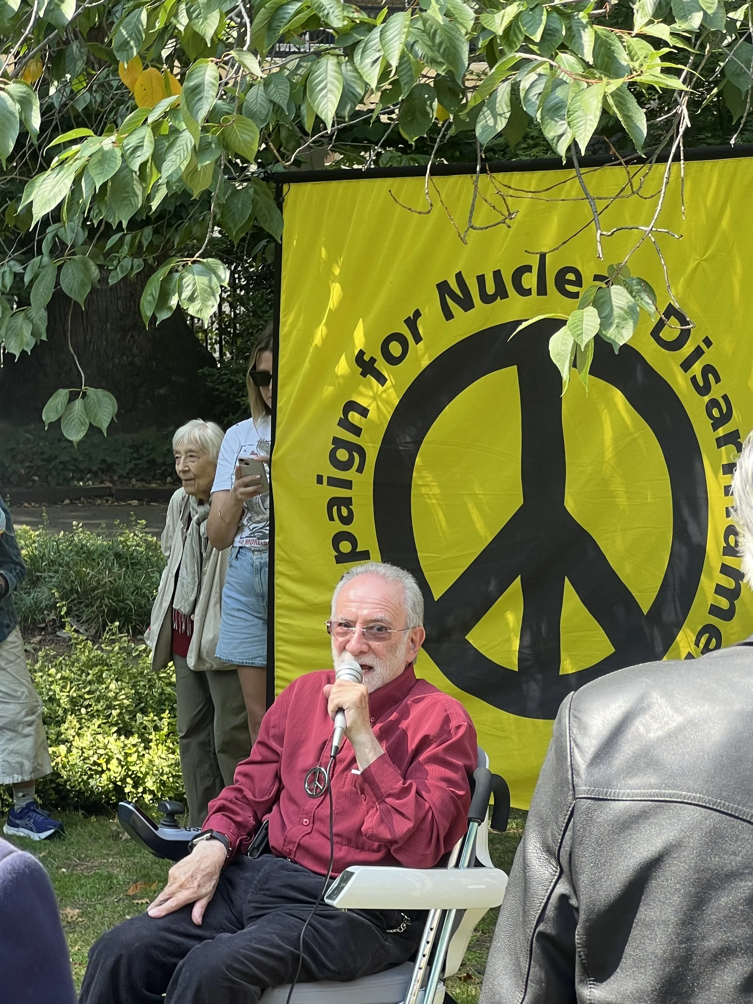 London CND came together in Tavistock Square Gardens on 6 August, led by Vice Chair Hannah Kemp-Welch, to mark 80 years since the US bombing of Hiroshima. Tens of thousands were killed instantly, and in the months that followed, radiation sickness and cancer claimed the lives of over 140,000 people.